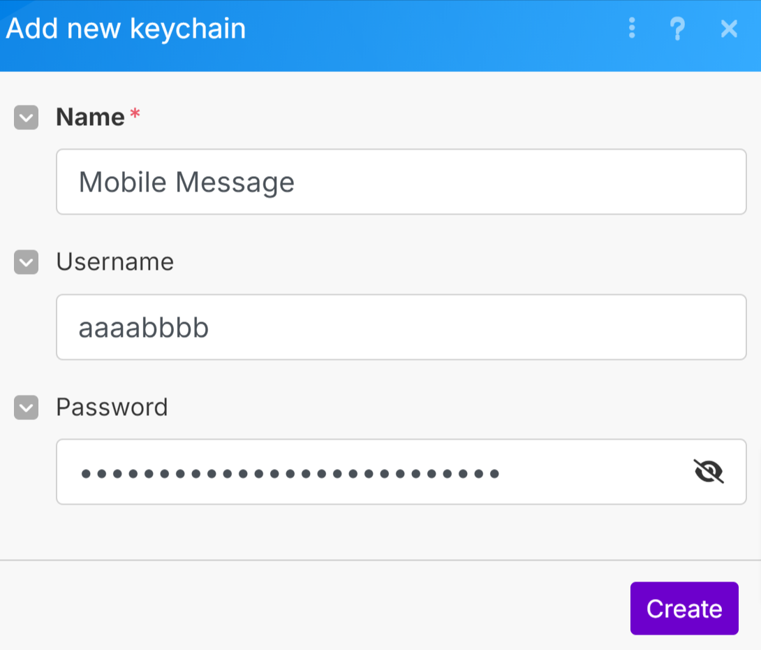- Enter a name (e.g., "Mobile Message") and add the Username and Password you copied in step 1. Then click Create.