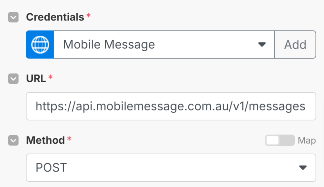 https://api.mobilemessage.com.au/v1/messages. - Set the Method to POST.
