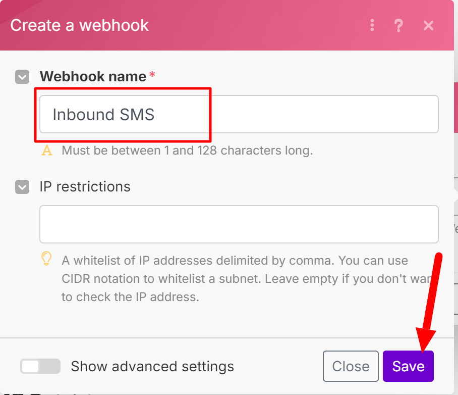 - Click Create a webhook, then give your webhook a name (e.g., "Inbound SMS"), and click Save.