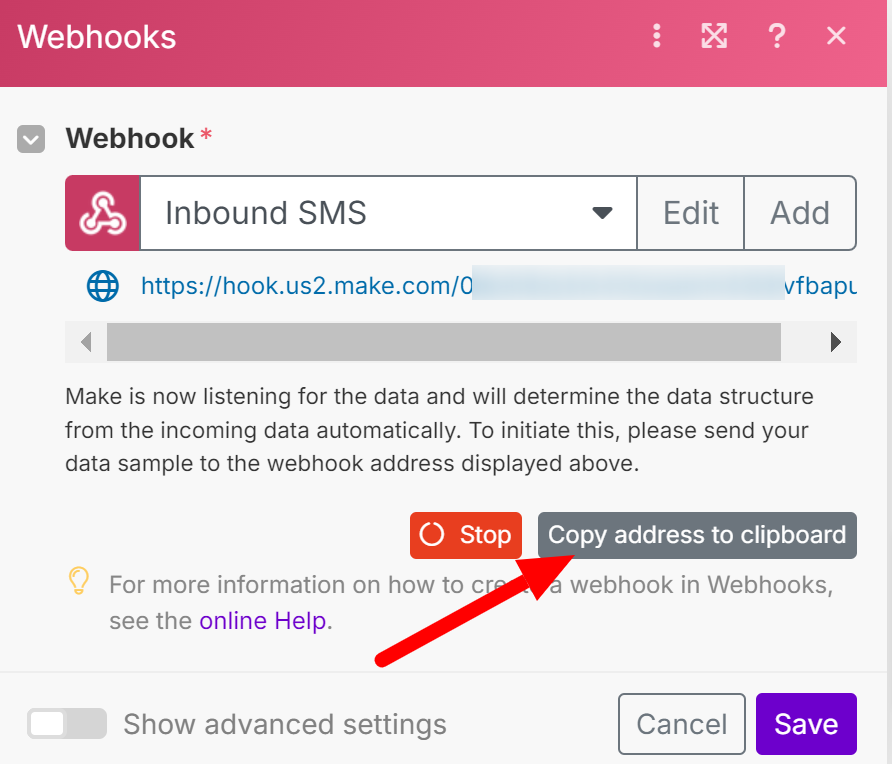 Below is a guide to set up inbound SMS handling in Make.com, using webhooks.