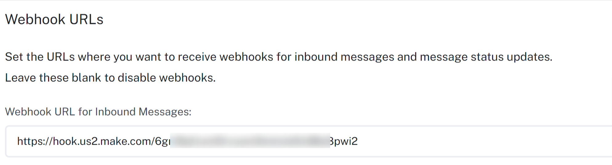 - Find the Inbound Message Webhook field and paste the unique URL from Make.com.