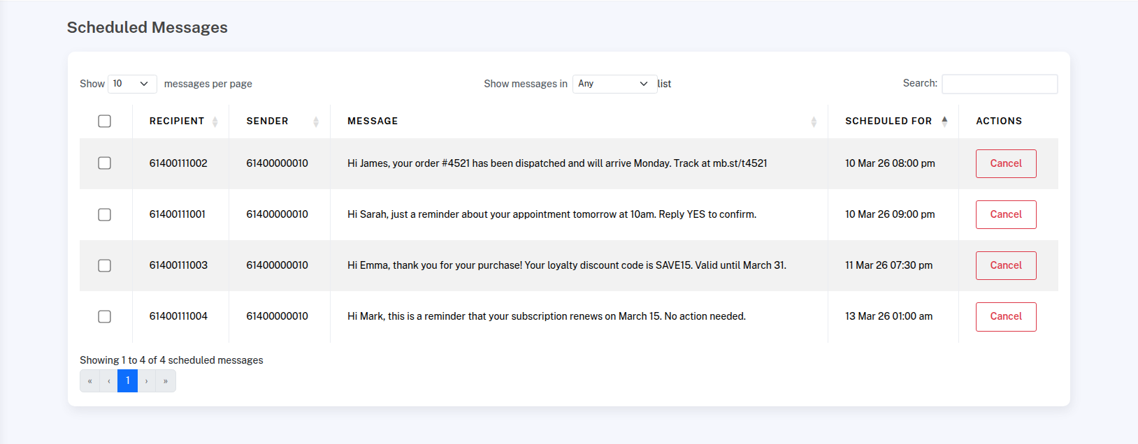 To cancel a scheduled message, go to Scheduled SMS from the menu. You’ll see a list of all messages that are waiting to be sent. To cancel a single message, click the red Cancel button next to that message.