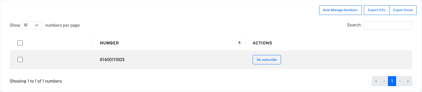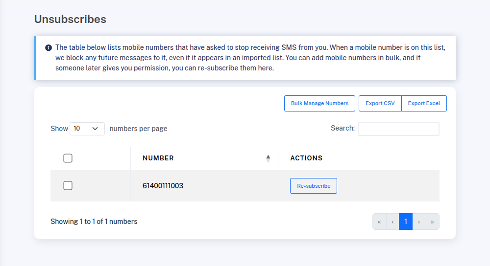 You can manually add or remove numbers from your unsubscribe list using the Bulk Manage Numbers button. This is useful if you are moving from another SMS provider, or need to re-subscribe a group of contacts.