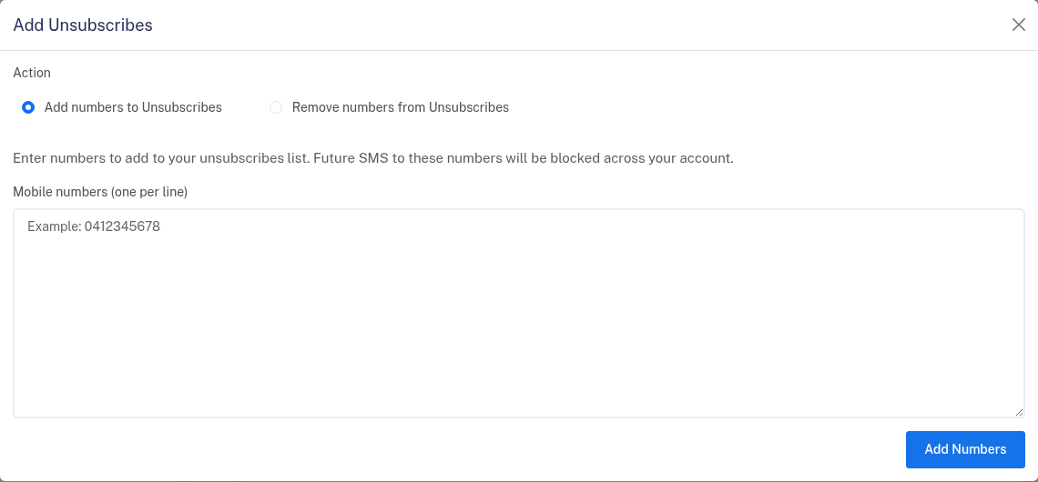 - Select either Add numbers to Unsubscribes or Remove numbers from Unsubscribes