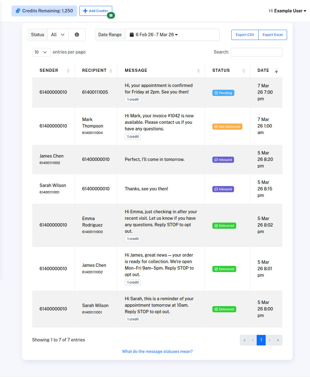Message statuses show where each SMS is in the delivery process. As a message moves through our system and the mobile networks, its status will update automatically.