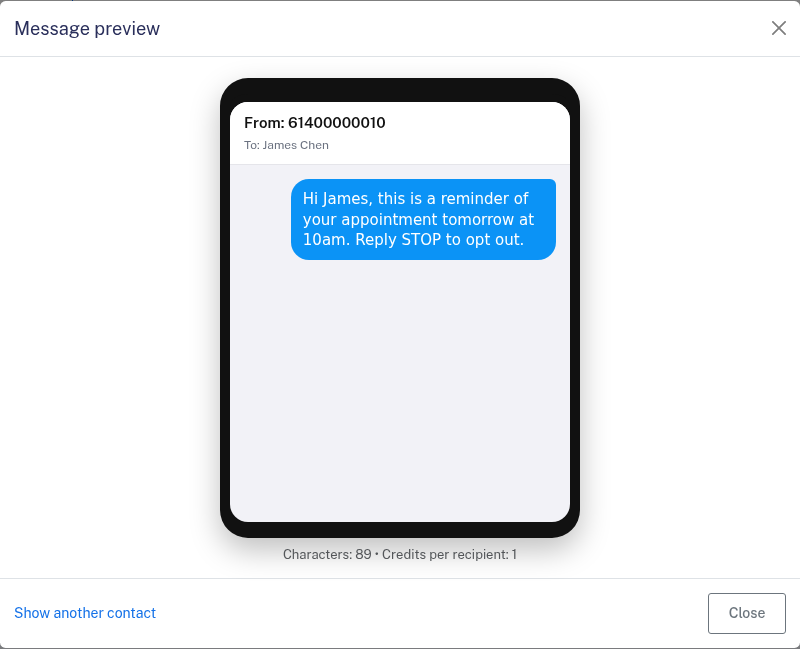 Before you send a message, you can preview exactly how it will look on the recipient's phone. This is especially useful when you're sending to a list with personalisation tags like {first_name} — the preview shows the actual values that will be substituted for each contact.