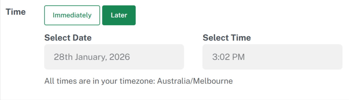 Your current time zone is displayed below the date and time selector so you can confirm it before sending. This ensures messages are delivered when you expect them to be.