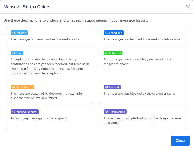 Scheduled — The message is set to send at a future date and time. You can view and manage scheduled messages on the Scheduled SMS page.