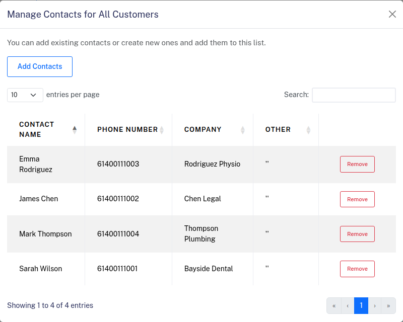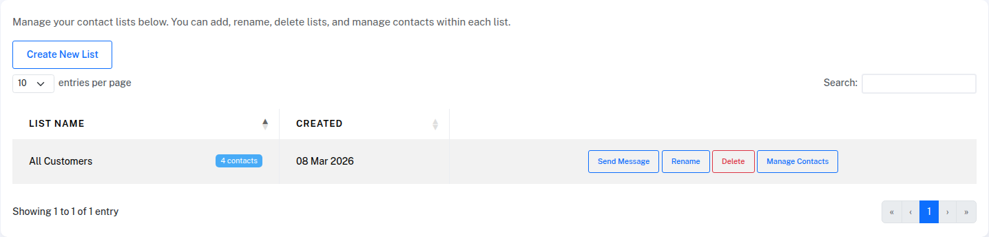Contact lists let you organise your contacts into groups — for example, "VIP Clients", "Monday Appointments", or "Newsletter Subscribers". Lists make it easy to send a message to a specific group without manually selecting contacts each time.
